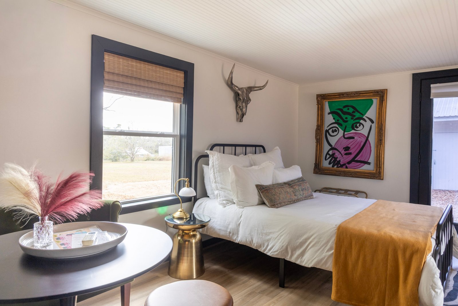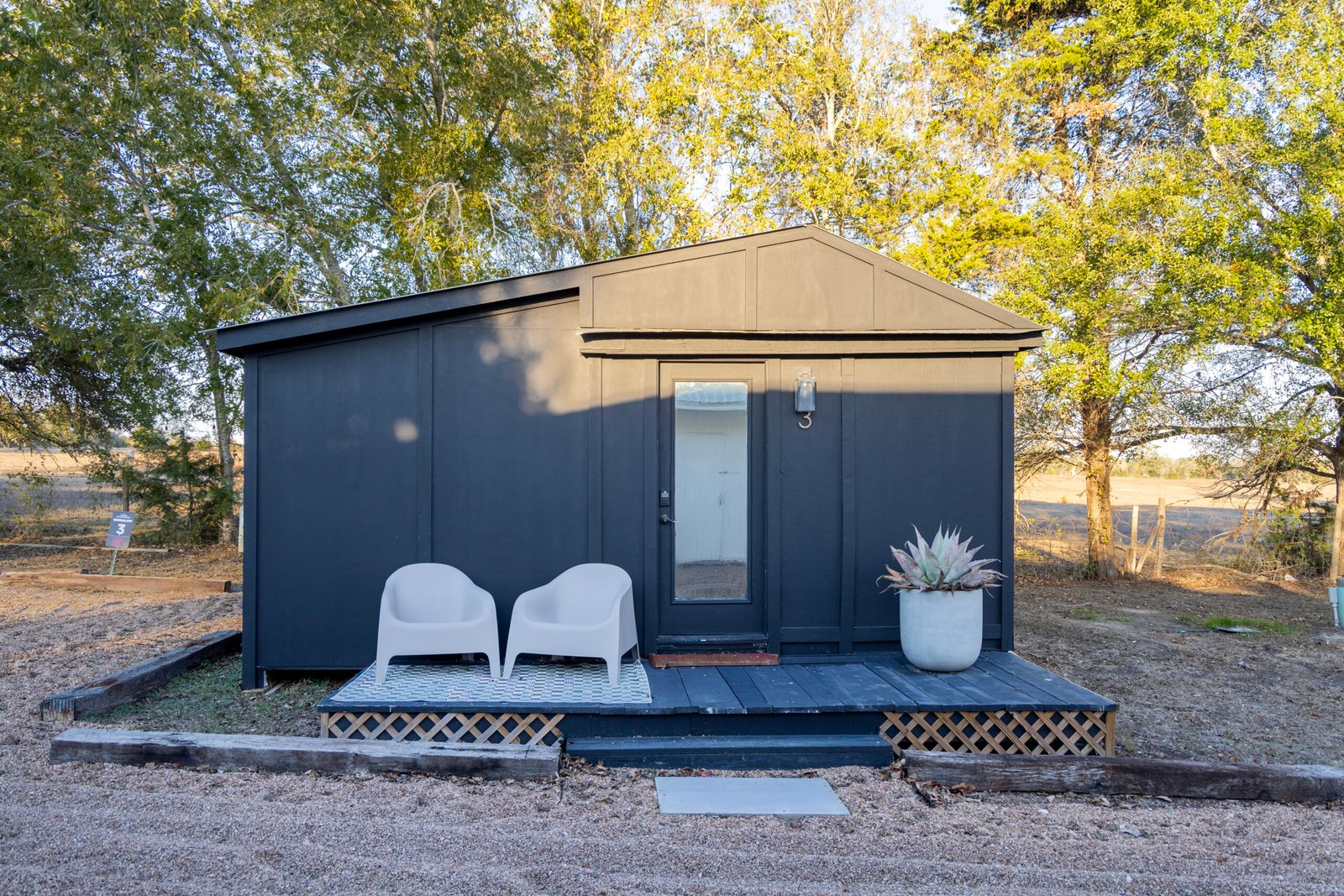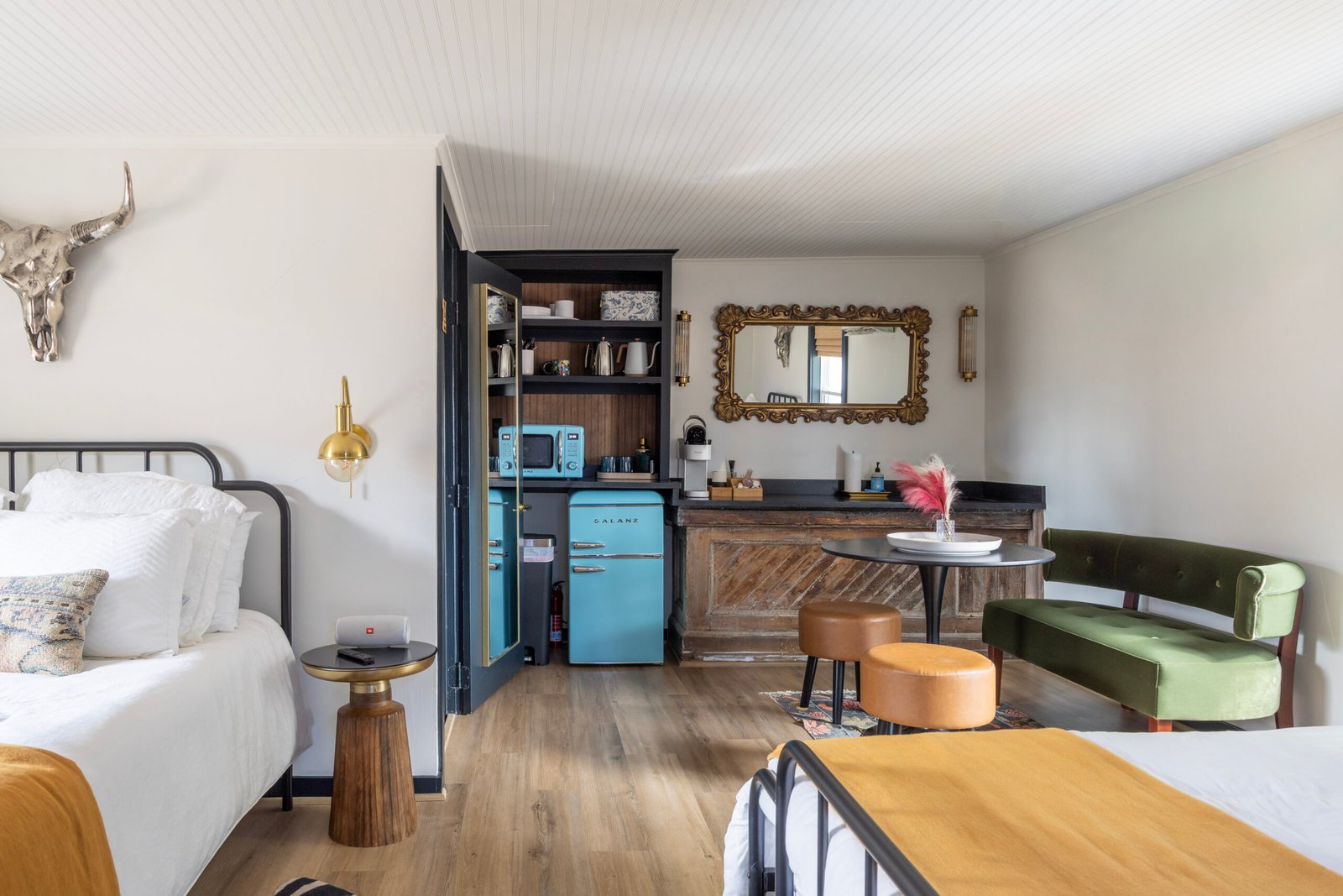 Bungalow 3 is our eclectic, newly expanded space that is quintessential Round Top-chic. With an added 100 square feet, it has 2 queen beds, a kitchenette and a small sitting area for its guests. The bathroom has been thoughtfully remodeled with a walk-in shower and modern vanity for a spacious retreat. Bungalow 3 is tucked away towards the back of the property with views of the tree lined acreage.